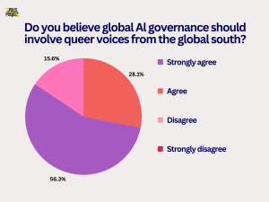 The survey asked respondents, “Do you believe global AI governance should involve queer voices from the Global South?” A majority of respondents (56.3%) strongly agree with the statement, while a further 28.1% agree, bringing total support to 84.4%. In contrast, 15.6% of respondents disagree, and none strongly disagree. These findings indicate a consensus among the majority of participants that queer voices from the Global South should be included in global AI governance discussions.