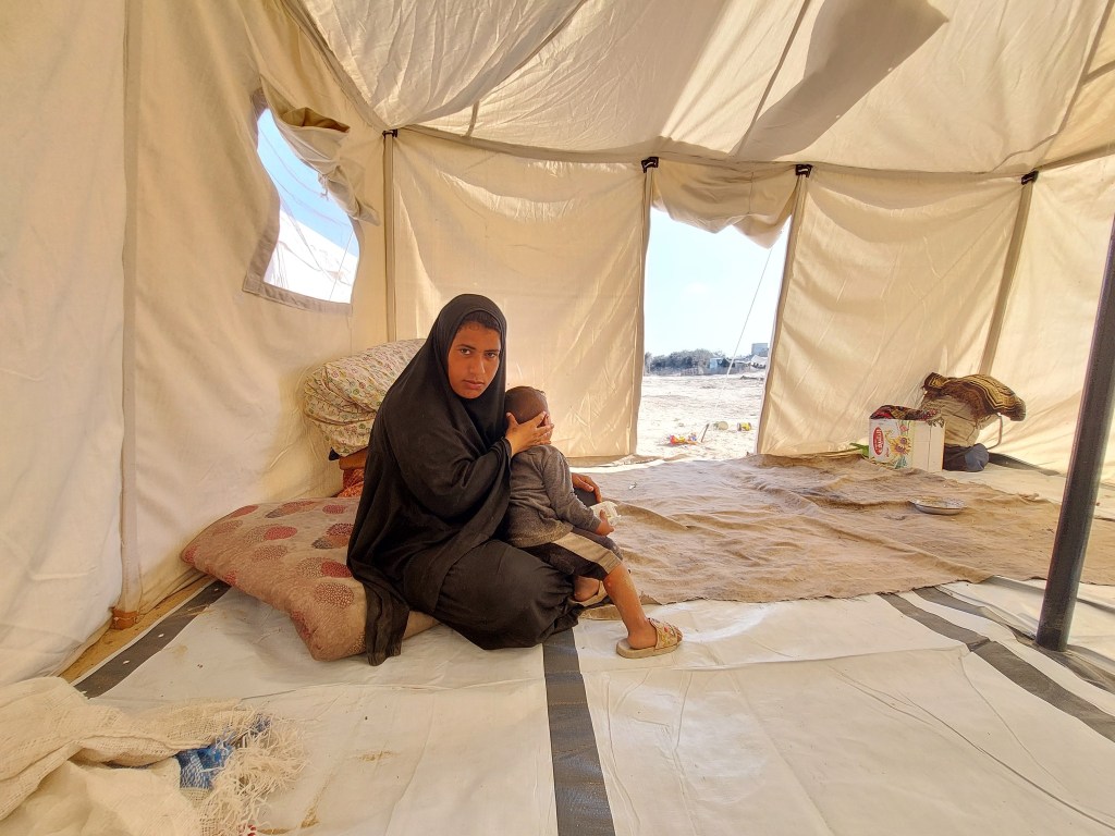 At the edges of the Nuseirat refugee camp in southern Gaza, Sadiqa Abu Hashish, 23, sits inside a tattered tent, holding her three-year-old daughter, trying to soothe her. She fled the Shuja’iyya neighborhood in northern Gaza in February 2024, joining the millions displaced by Israel’s war on the region.