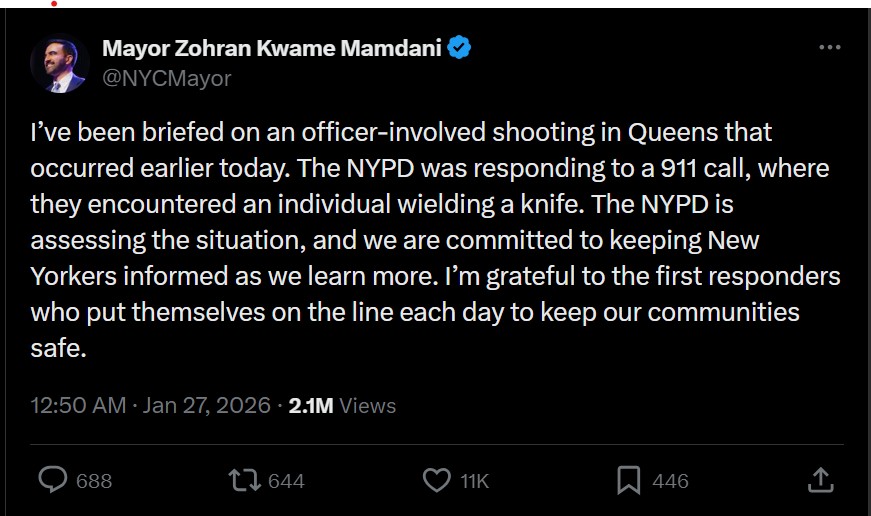 Mayor Zohran Mamdani swiftly characterized the incident as “officer-involved shooting” and praised the officers as “first responders who put themselves on the line.” The family condemned Mayor Mamdani’s statement, questioning, “Why is the Mayor applauding officers who recklessly almost killed our son in front of us?”