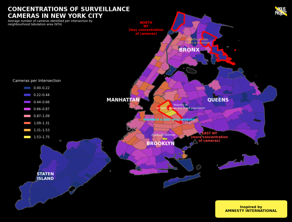 DAS has disproportionately targeted communities of color through higher camera concentrations in Black/Latino neighborhoods—like East New York in Brooklyn (54% Black, 30% Hispanic), the most surveilled area. There are 577 DAS-compatible cameras at intersections in East New York, far exceeding whiter areas, and they have correlated directly with historical stop-and-frisk hotspots. Amnesty International’s mapping of over 15,000 NYPD-accessible cameras across Manhattan, Brooklyn, and the Bronx confirms denser surveillance in majority non-white communities, amplifying “digital stop-and-frisk” in the Bronx, Brooklyn, and Queens. This occurs alongside routine surveillance of mosques, Black Lives Matter rallies, and immigrant areas via license plate readers logging billions of scans.