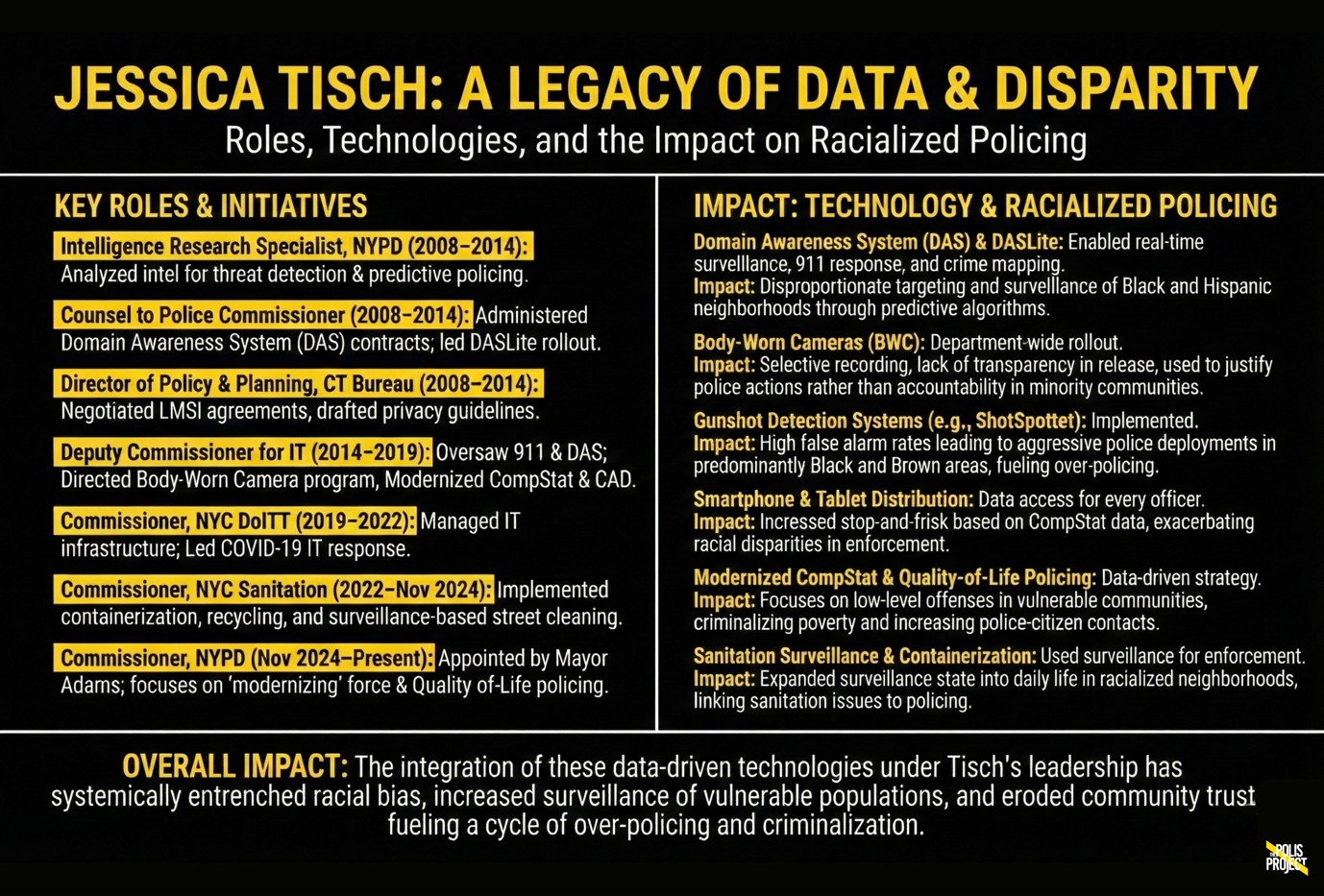 Commissioner Jessica Tisch’s career trajectory neatly overlays New York City’s pivot toward intensified surveillance and the steady militarization of the NYPD. Joining the force in 2008, she advanced through pivotal civilian roles in counterterrorism and information technology—overseeing the Domain Awareness System, body-worn cameras, and data-driven tools—before ascending to commissioner in 2024, all while embodying the city’s fusion of billionaire capital, technocratic governance, and carceral power sustained by elite donors and foundations.