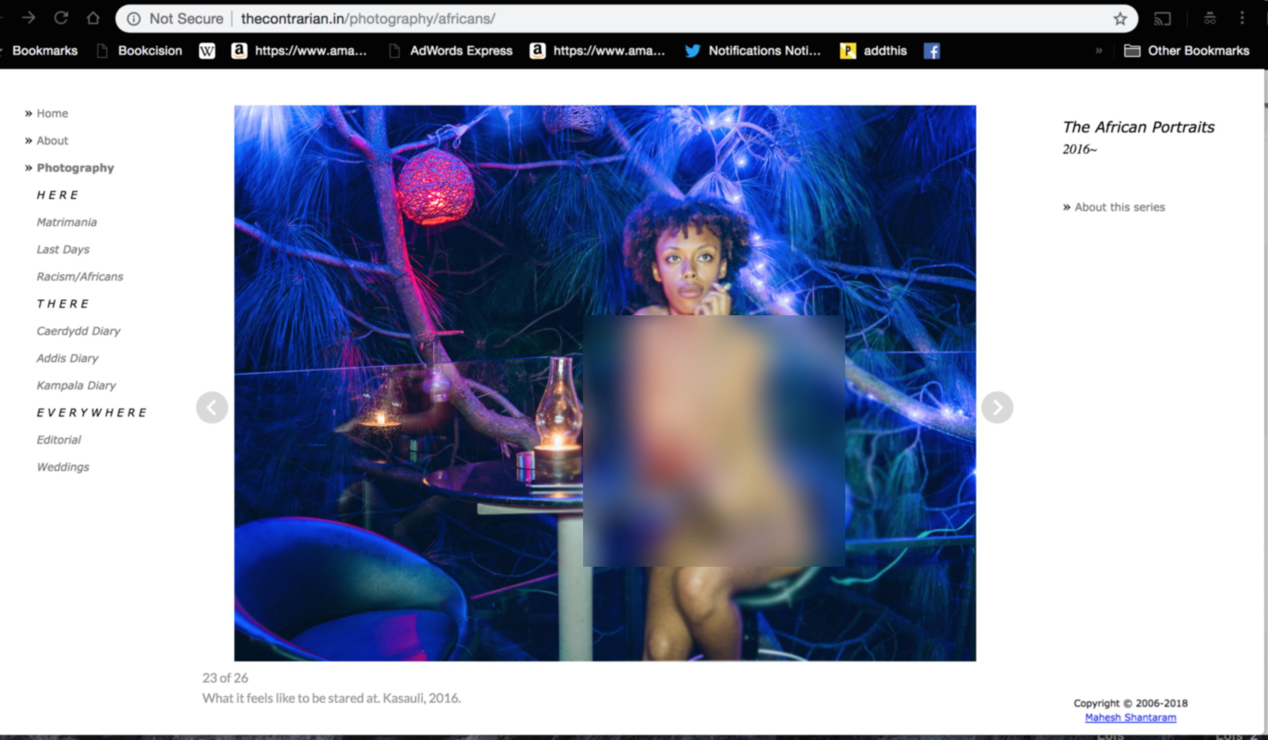 At the exhibition, Mendes spoke to Samuel Jack of the AASI who along with the other students had serious concerns about the image of the four boys posed next to the fridge and the naked photograph of the African-American woman displayed in the exhibition. The AASI, according to Mendes, conveyed the message to Shantaram about how they thought both these images were objectionable. However, nothing happened after this complaint and the exhibition continued. One of the students who was present at the exhibition corroborated the events. He added that he was angry about the nude because many Indians already perceive Africans in a bad way: “They say Africans came here to do prostitution, they came here to do bad things.” For him, the images of the naked black woman in the bar only confirmed such racist impressions and he asked Shantaram to take the image down. He stated that everyone was angry and upset and Shantaram promised that he would take down the image and never publish it again. However, as previously stated, the image continued to be exhibited and appeared on his website, removed just hours before this essay was published.