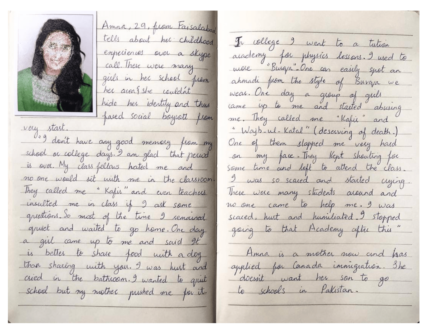 “I don’t have any good memory from my school or college days. I am glad that period is over. My class fellows hated me and no one would sit with me in the classroom. They called me ‘kafir’ and even teachers insulted me in class if I ask some questions. So most of the time I remained quiet and waited to go home. One day a girl came up to me and said it is better to share food with a dog than sharing with you. I was hurt and cried in the bathroom. I wanted to quit school but my mother pushed me for it. In college, I went to a tuition academy for physics lessons. I used to wear ‘burqa’. One can easily spot an Ahmadi from the style of burqa we wear. One day a group of girls came up to me and started abusing me. They called me ‘kafir’ and ‘wajub-ul-kata’ (deserving of death). One of them slapped me very hard on my face. They kept shouting for some time and left to attend the class. I was so scared and started crying. There were many students around and no one came to help me. I was scared, hurt and humiliated. I stopped going to that academy after this”
