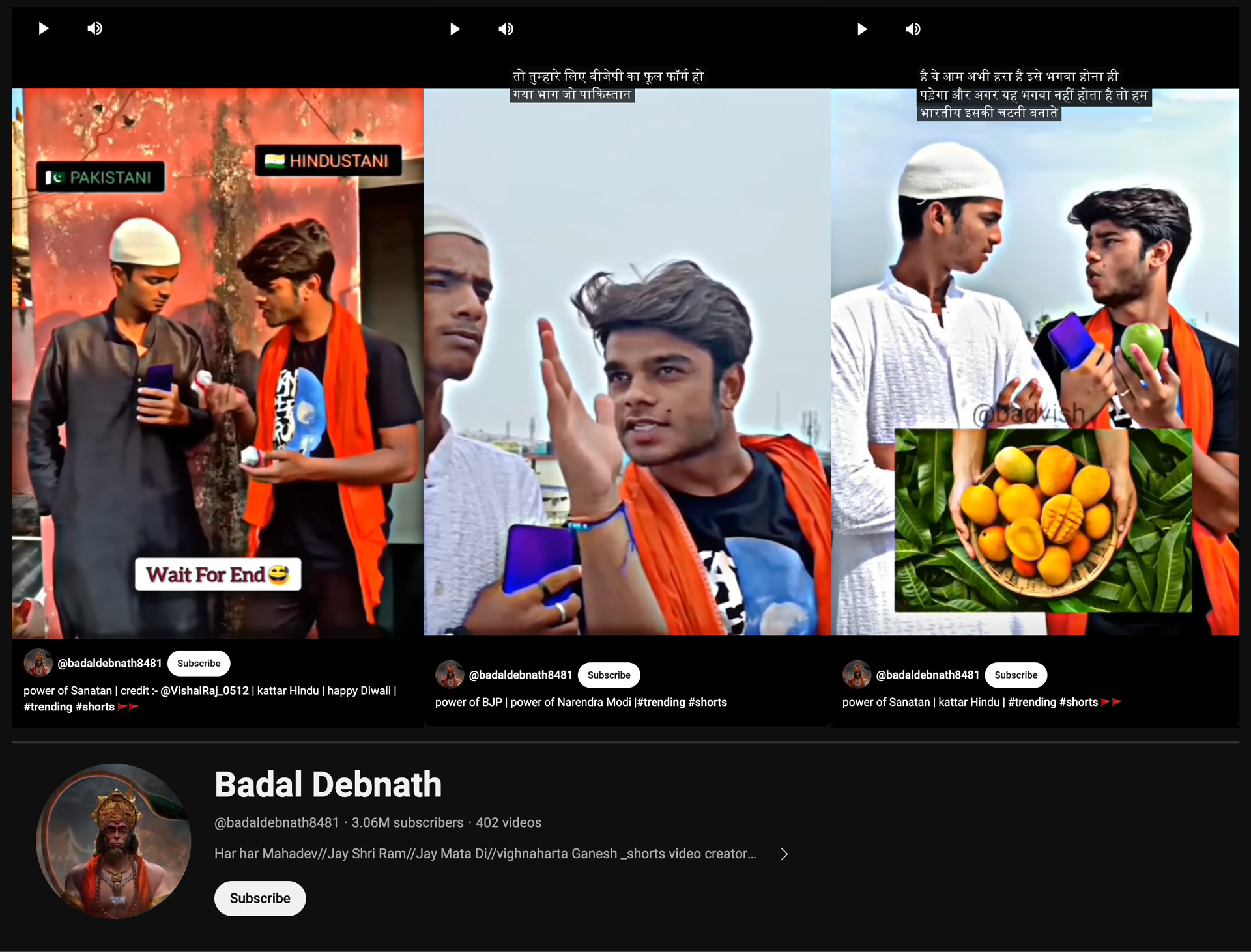 On the other hand, Badal Debnath channel compiles videos from different channels with a running theme of Hindu supremacy over Muslims, and generally pertain to Indian politics. Vishal Raj is a creator whose videos frequent the channel and are among its most popular. In most of Raj’s videos, the word “Pakistani” is often written above the Muslim character, played by a Hindu actor, and “Hindustani” above the Hindu characters. In one video, the Hindu character comes to the Muslim character and says, “There is good news for you and there is sad news. The good news is that the Ram temple has been built, the sad news is that now it is the turn of Kashi Mathura.” In another video, which has 4.5 crore views, a Muslim character says, “Brother, look, even the colour of mango is green.” The Hindu character responds, “It is green right now but it will have to turn saffron. If it doesn’t, then we Indians make chutney out of it.”