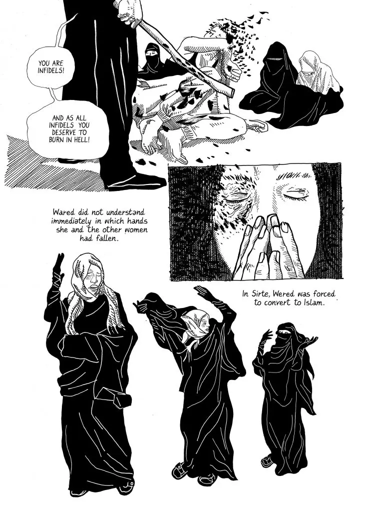 Published in Italian in October 2019 and followed a year later by a French edition, the graphic novel looks at the war in Libya from the point of view of the people whose lives have been upended by years of violence. This is perhaps one of the greatest contributions of the book: a change of scale, a narration of the war from the ground up. Libia casts aside the broad strokes of the geopolitical discourse and zooms in on people’s lived, daily experiences of war. Each chapter is centered around a person or a group of people providing a humanizing account of the struggles, pains and challenges glossed over by news reports.