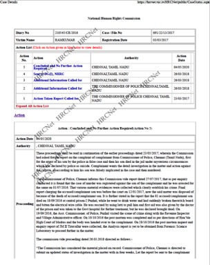 Ramkumar, from Tamil Nadu, was arrested by the Chennai Police on 2 July 2016 in connection with the alleged murder of Swathi, a 24-year-old IT professional on 24 June 2016. He died on 18 September 2016 in judicial custody in a Puzhal Central Prison – a high-security prison in Chennai. On 4 May 2020, the National Human Rights Council (NHRC) closed the file regarding Ramkumar’s custodial death stating that the complaint was not substantiated: based on the Police report, Ramkumar had been arrested on properly formed charges and there was no reason to believe that his death was not a suicide. The NHRC registered a case in March 2017 and closed it in 2020, deciding that there was “nothing on record” to indicate Ramkumar was falsely implicated or murdered.