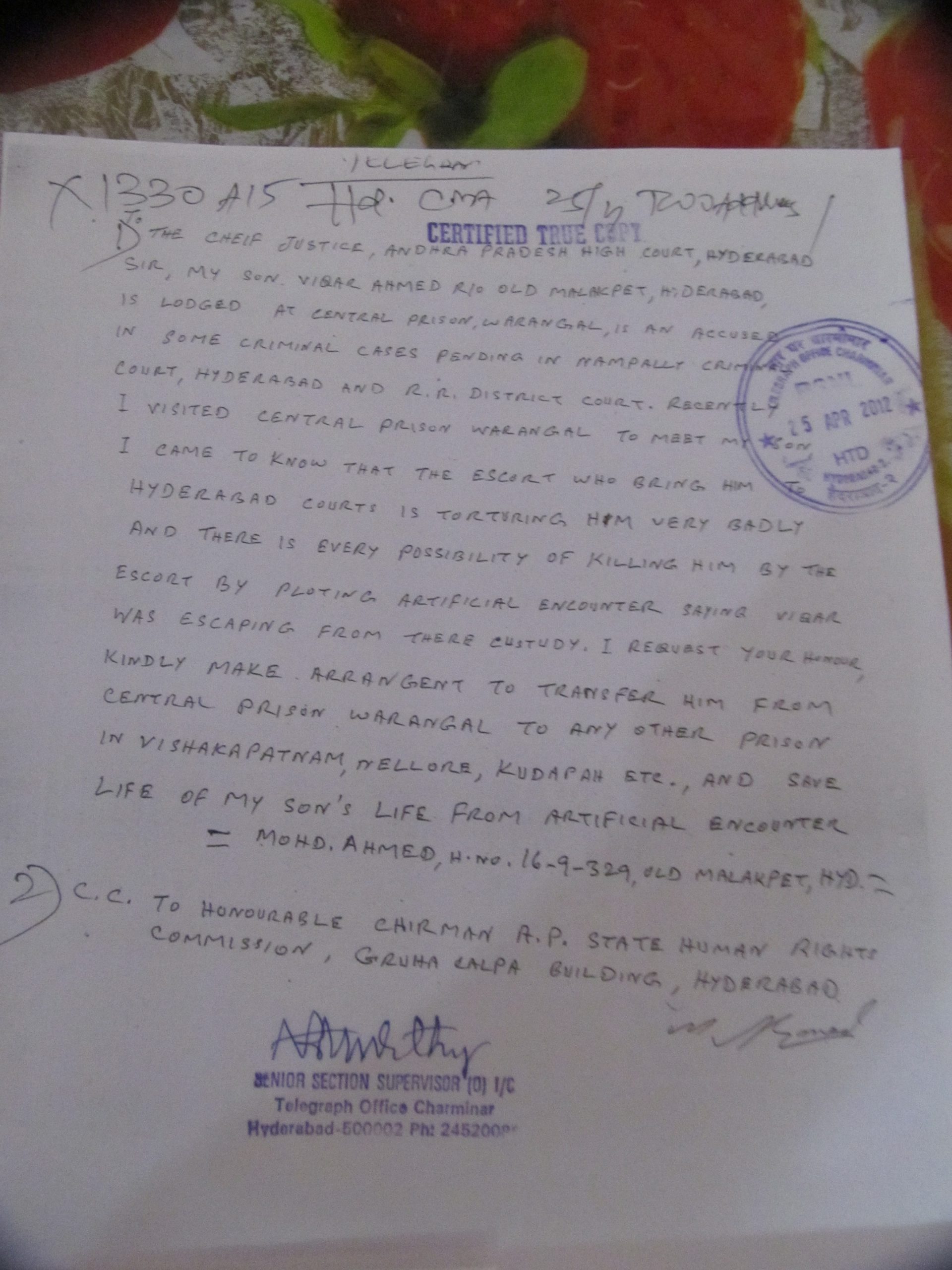 The fact finding report conducted from 12 to 14 April 2015 by Civil Liberties Monitoring Commission (CLMC), a Hyderabad-based human rights organization stated that in Ahmed’s case the Alair Police had filed a case against the deceased under Section 307 of the IPC (attempt to murder), but did not file a case against the Police personnel involved in the killing under Section 302 of the IPC (punishment for murder).